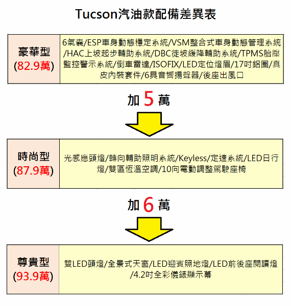 綜合以上分析,時尚型只要比入門車型多5萬元,便可兼顧安全與多數便利性配備,重點是一旦用習慣Keyless系統,就回不去了。但是要升級到尊貴型得多付出6萬元,配備主要僅差在雙LED頭燈與全景式天窗,這兩項並不是人人需要,甚是可能增加日後成本增加。最後結論,時尚型無疑是Tucson汽油車型C/P值最高者,不高貴、卻提供絕多數精髓配備。