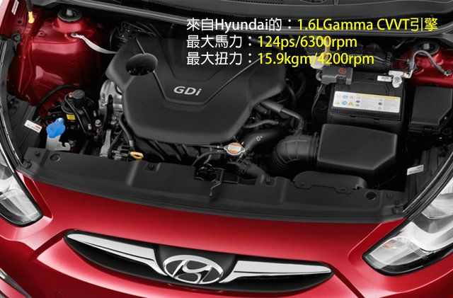 Hyundai Verna優越馬力,領先同級別車型。下面就讓我們看看Verna的動力表現,從數據上觀察,Verna動力清一色搭載了1.6L自然進氣的Gamma CVVT引擎,但在6300rpm輸出時最高可達到124匹馬力值 ,在國產的小型房車上數據並不示弱,但由於變速箱採用了4速手排的設計,因此估計整體加速和油耗體現上,實際落差不會有太大。