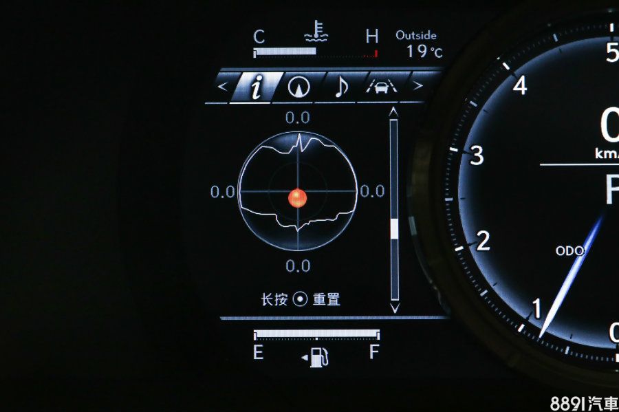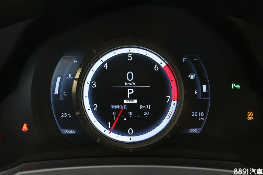 F Sport車型專屬的單環式數位動態儀錶周遭以鍍鉻飾條圍繞,兼具質感與科技感。選擇Sport模式時,轉速表會改為白色光源,提升辨識度。除了平常一般的顯示模式,當需要更多信息時,藉由方向盤上的按鍵設置,儀表左側就會出現其他資訊顯示,其顯示內容相當多元,如音響系統、油耗、車道偏移、車距維持等,G值顯示功能則為此次小改款新增項目。