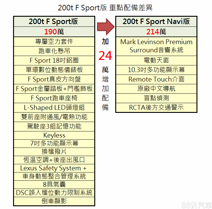 IS200t F Sport及F Sport Navi版價差達24萬,主要在於後者增添多樣便利配備,客觀來看,此價差所換得的配備C/P值不算高,畢竟會選擇F Sport車型的買家,應是多偏好其運動化魅力,減少一些方便性,就能把價格壓至200萬以下,就經濟考量方面,也不失為一筆好打算。