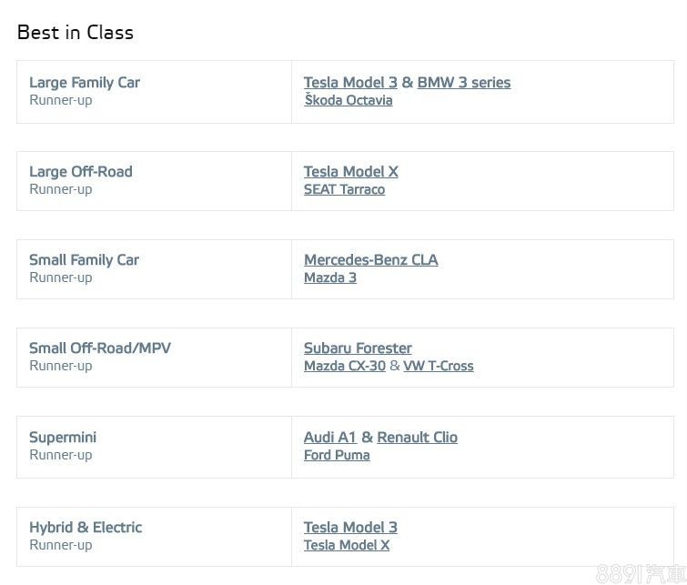 Large Family Car中大型家庭用車則是以Tesla Model 3和BMW 3 series奪下冠軍,而Skoda Octavia居次,值得一提的是,Model 3是進榜車款中在安全輔助項目評分上最高者。