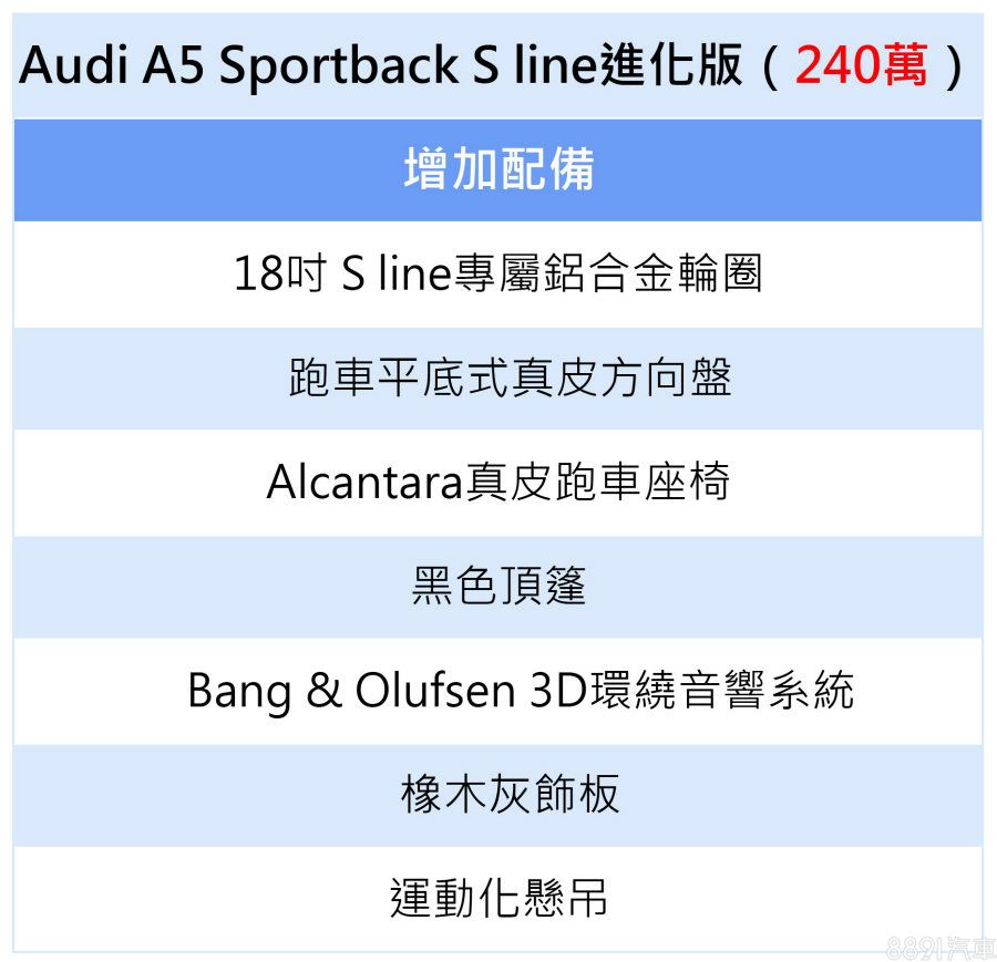 Audi A5 Sportback S line進化版是以二階、開價235萬元的40 TFSI S line S tronic為基礎,在外觀上追加造型更犀利的18吋S line專屬鋁圈,為顏值加分。