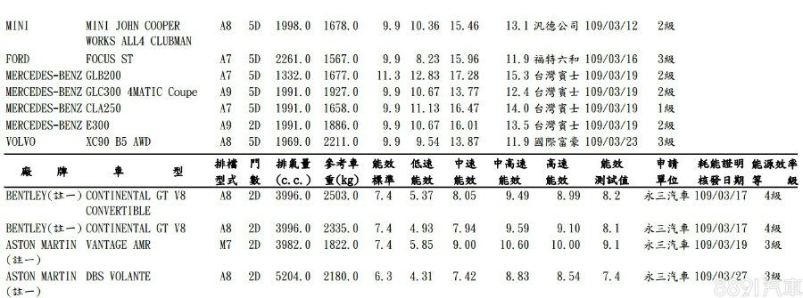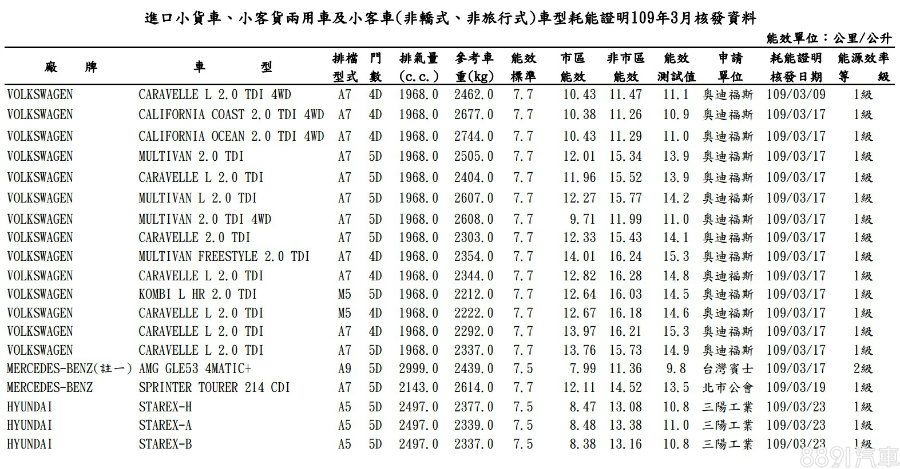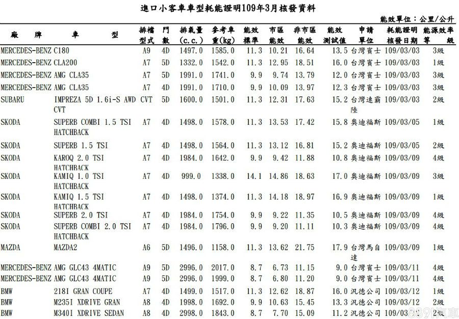 Superb 2.0 TSI車型亦同步現身,預計應為小改款車型,新車業已於2020台北車展現身,房車與旅行車版本平均油耗分別為10.5、10.3 km/L。其他還有甫上市的Ford新Focus ST(11.9km/L)、M.Benz GLB 200(15.3km/L)、小改款Mazda Mazda2(17.9km/L)。