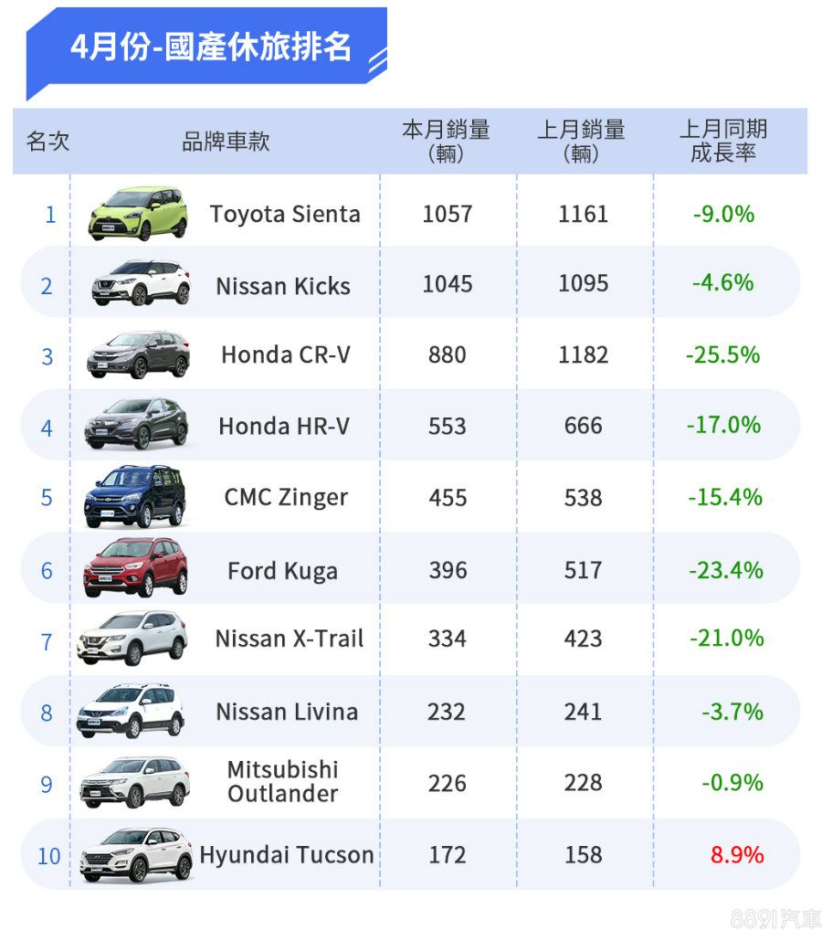本月份國產休旅龍頭寶座的位置回到了Sienta的身上,雖然銷售量也是些許下滑,但維持著1,057輛的成績,險勝了第2名的Kicks,睽違許久拿下的冠軍寶座,而Kicks本月份排名也上升一個名次,同樣也是維持著破千輛的表現,在小型休旅的級距當中可謂是毫無對手,展現了強大的競爭力。