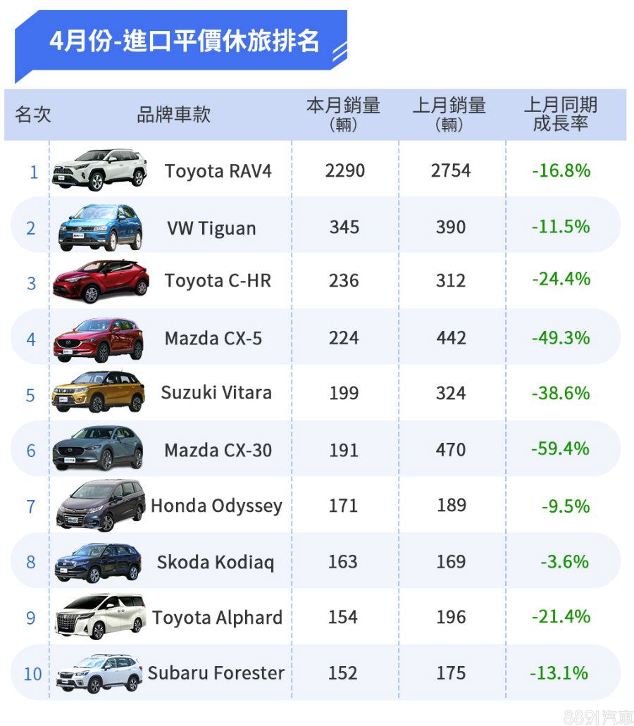 4月終於不再是「RAV4的天下」,雖仍壓倒性強占進口銷售寶座,但總算讓Altis扳回一城,在後者推出GR Sport版後,是否會對RAV4強勢的銷售實力造成威脅值得觀望。