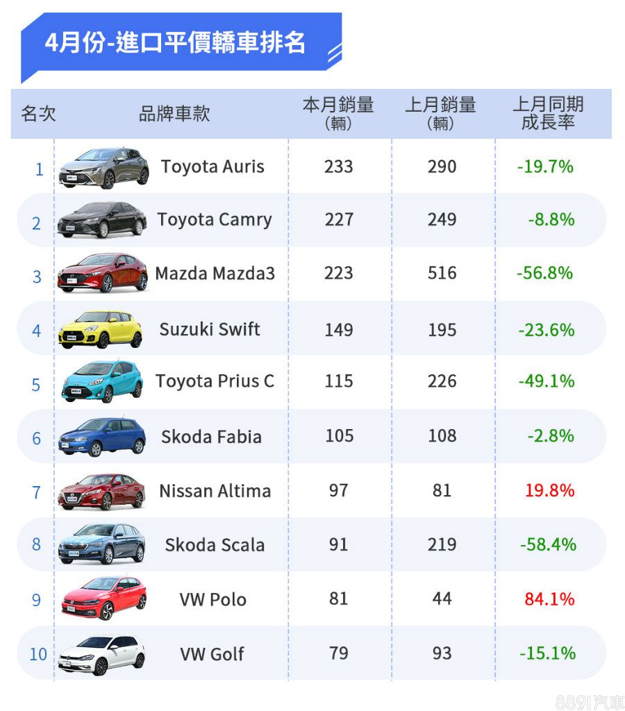 而另外兩個正成長的分別是Hyundai Tucson以及Luxgen URX,尤其是後者擺脫了上個月委靡不振的銷售,本月份成長超越200%,值得讚賞。另外Altis也新增了GR Sport車型,不過在4月底才正式上市,在銷售成績上並沒有太過亮眼的表現,雖然還是維持著國產車的冠軍寶座,但整體的銷售量有些許的下滑。