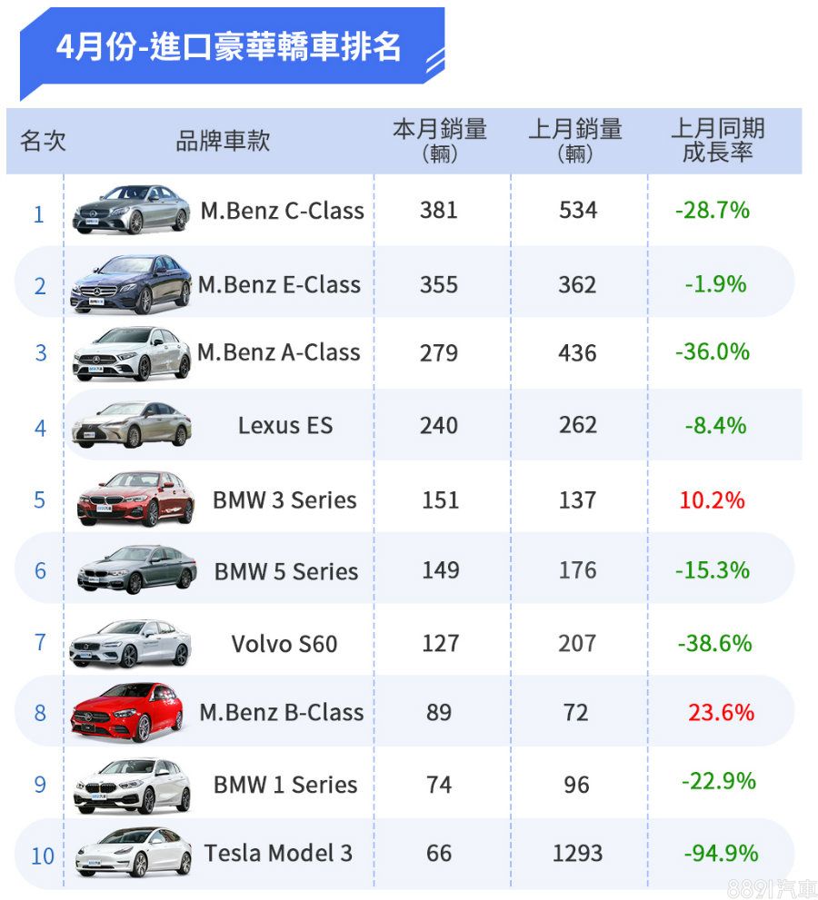 3月「大爆發」的Tesla多少受船期影響,4月回到「冷靜期」,3月拿下第五的Model X「消聲匿跡」,下個月還可以在期待一下其表現,另甫於4/30上市的GLB是否能在5月有所表現,頗值得關注。
