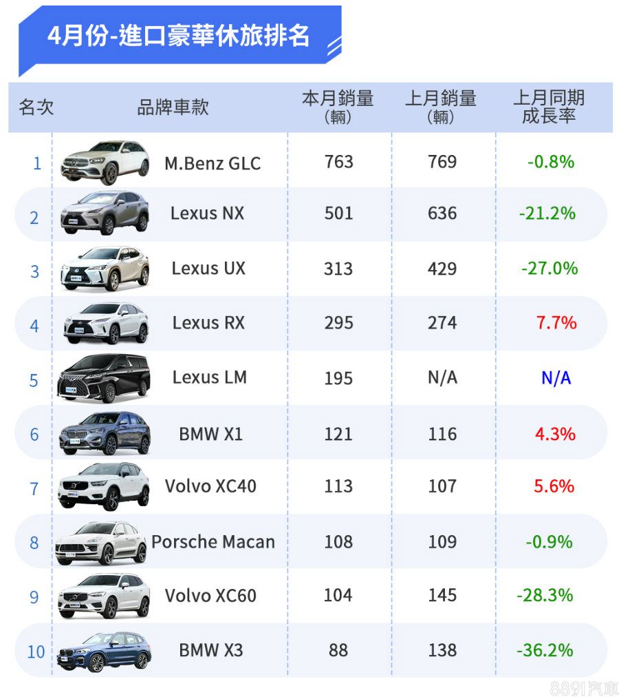 豪華休旅部分4月份依舊由GLC拿下冠軍寶座,本就是資優生的它銷售衰退幅度極小,而Lexus NX亦僅次於它。