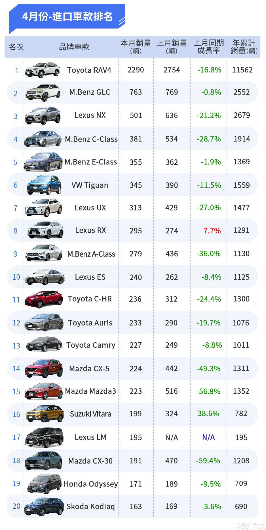 今年第一季,CX-30累計銷量僅略少於C-HR不到50輛,4月表現略顯疲軟,估計為新車到港因素,Skoda Kodiaq為榜上負成長最少的車款,雖說7座休旅在台非熱門戰場,但Kodiaq確實為同級中銷售表現最穩健的車款。