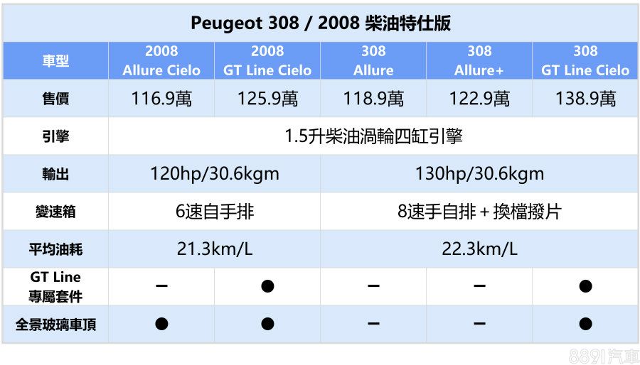 另外,原廠隨特仕版也針對兩車系追加GT Line車型,外觀換上於專屬水箱罩及尾飾管、黑色後視鏡蓋等,車室則配置GT Line專屬座椅。同時並針對2008特仕車全車系及308 GT Line Cielo等特仕車型標配全景式玻璃車頂。