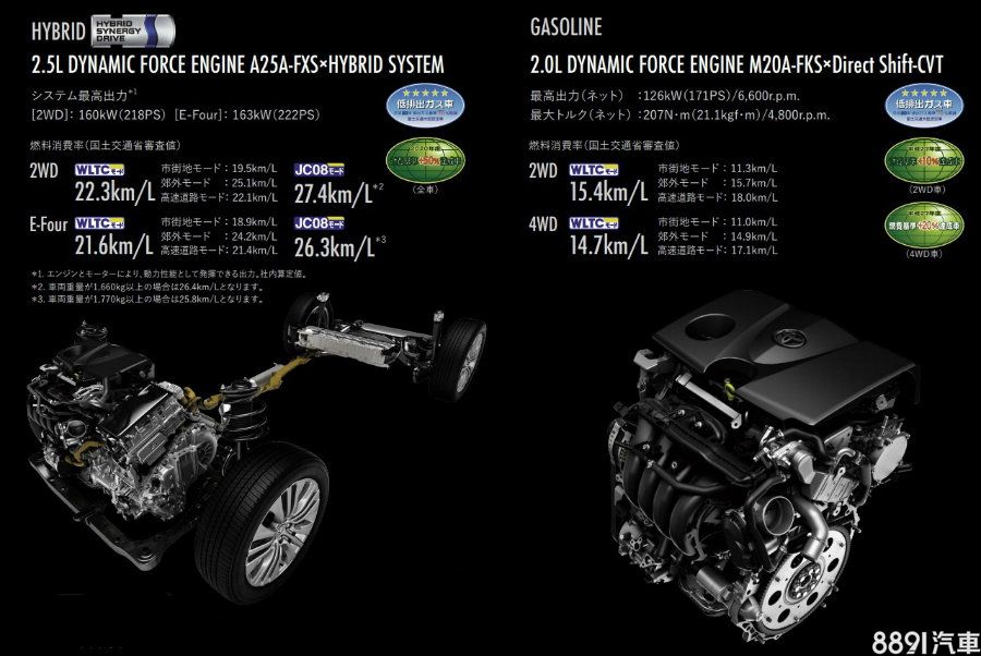 日規新Harrier提供2.0升四缸自然進氣汽油引擎與2.5升Hybrid動力,前者可產生171hp/21.1kgm之最大輸出,後者綜效馬力為218hp(前驅、四驅為222hp),均可選前驅和四驅版本。