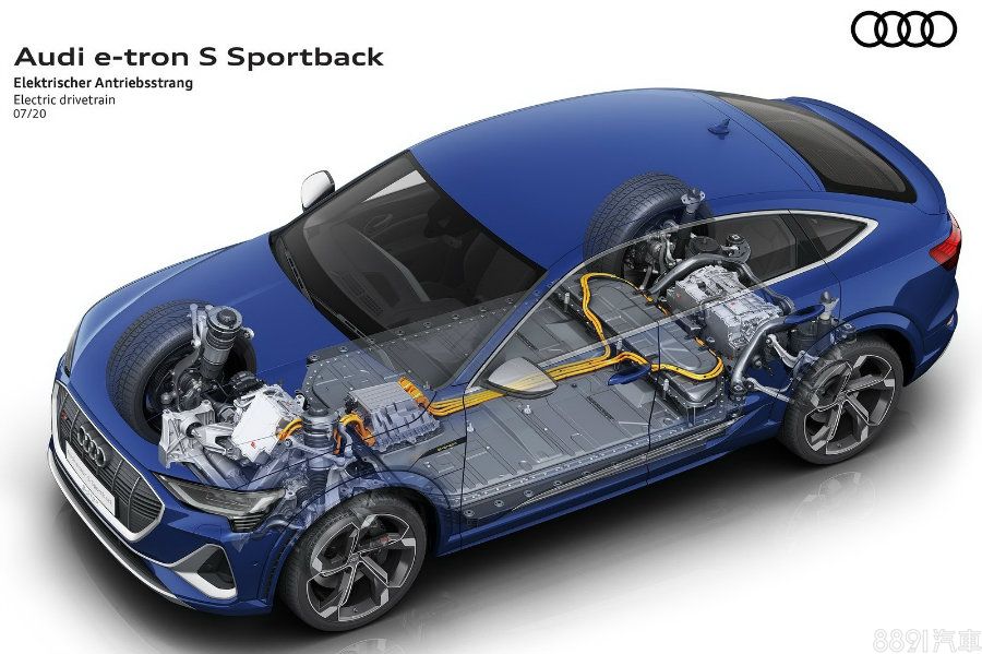 作為車系性能二軍,e-tron S Sportback和e-tron S不同於e-tron /e-tron Sportback 的前後軸的2具電動馬達架構,採用的是前軸1、後軸2共3具電動馬達,加上95kWh電池組,最大出力為496hp/99.2kgm,可維持在此輸出狀態達8秒,0~100km/h兩者均為4.5秒,極速210km/h。