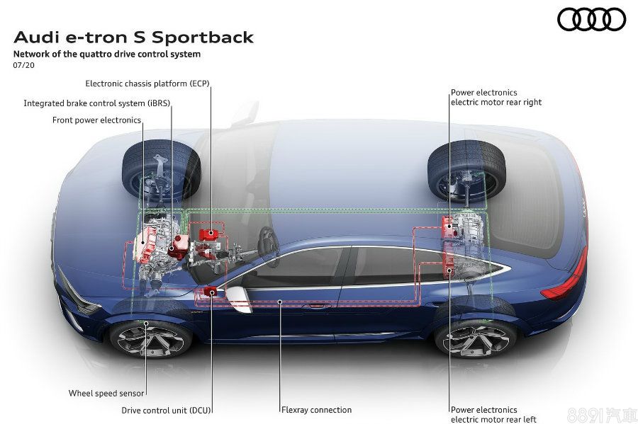 雖說e-tron S Sportback和e-tron S均為四驅設定,但原廠表示,一般用路狀況下,均是由後軸兩具馬達驅動車輛,前軸馬達只在有需要更多動力或後輪失去循跡性時加入,本質與後驅車相近。另新車配置可將車身高度最多調整76mm的運動化氣壓懸吊、電動扭力分導系統,搭配ESC的Sport模式、有7模式可選Audi drive select的Dynamic模式,駕駛樂趣不會遜於傳統燃油後驅車款。