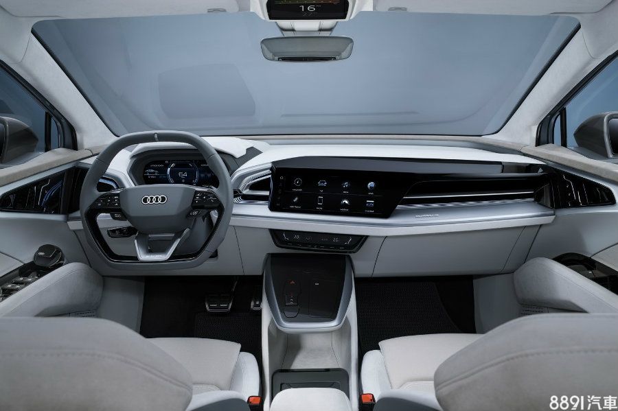 車室亦與Q4 e-tron Concept採相同格局,極簡而富流動感的鋪陳頗具質感,並運用多種環保材質,招牌的數位儀錶、具虛擬實境功能的抬頭顯示幕、12.3吋觸控式多媒體系統、智慧型手機無線充電裝置等強化科技感,採用按鍵式排檔以此而騰出更多置物空間。