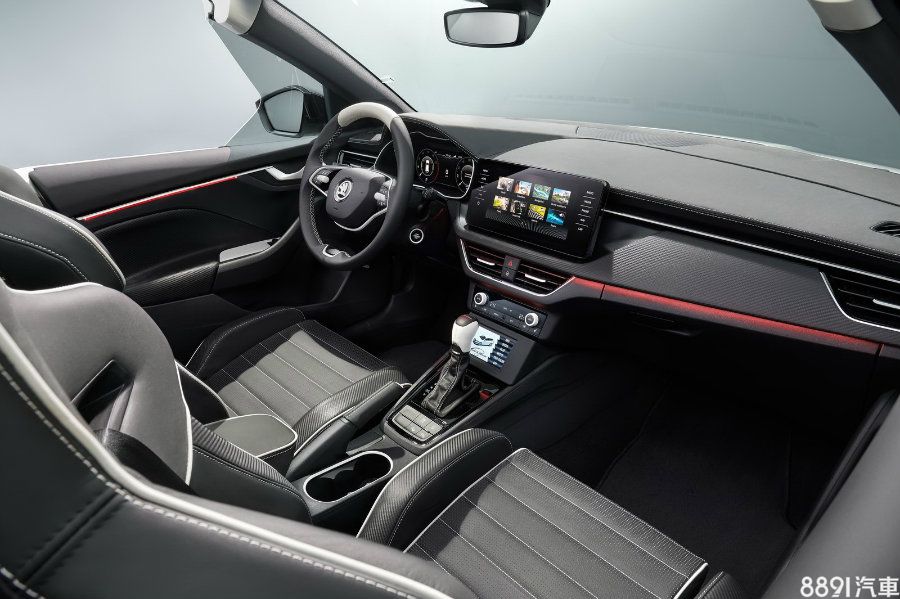 此外,Slavia在腰線、水箱護罩、鋁圈後方均配置了照明氛圍燈,燈色是以捷克國旗的藍、紅、白為選項,車尾Skoda字樣則能作為煞車燈、倒車燈之用。另新車搭載的是與Kodiaq RS同款的20吋鋁圈,以及尺碼為235/30R20的Continental SportContact 6配胎。