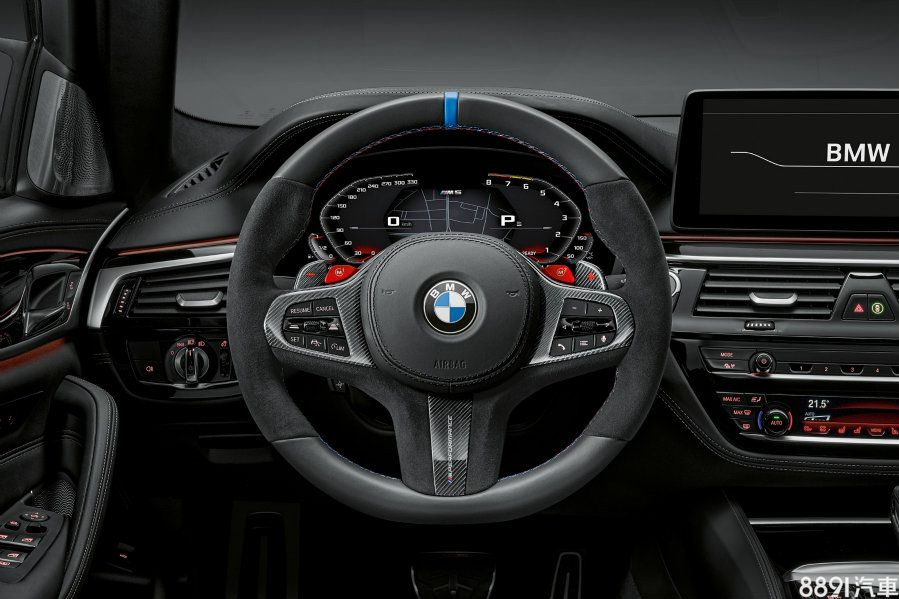 內裝方面,除了可選M款不鏽鋼踏板及地墊外,標準版5系列另可升級M款方向盤,盤輻採用真皮混搭麂皮包覆,12點鐘附有紅色指標,連同換檔撥片都用上碳纖維飾板點綴,M5專屬的版本「本質」上多了2組M Drive快撥按鍵,上頭指標改為藍色,連同排檔座也全數換上碳纖維飾板,視覺上確實增色不少。