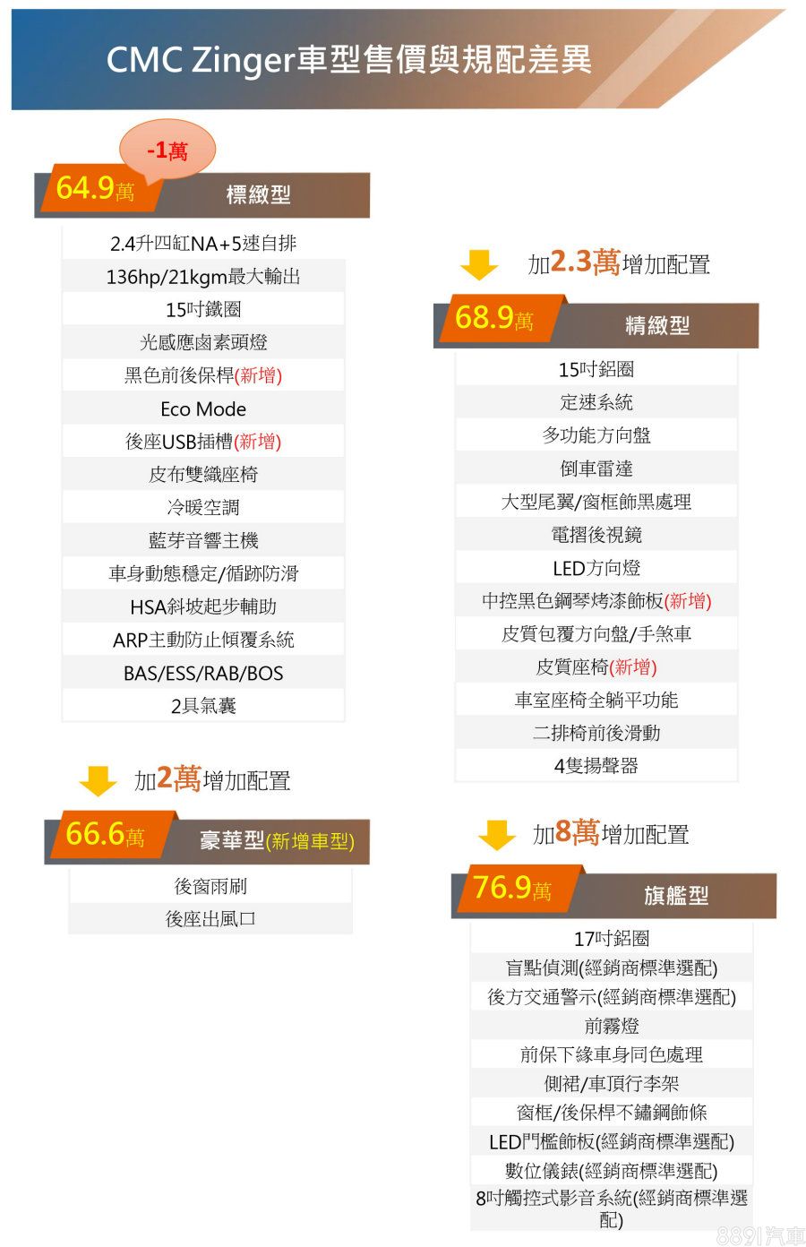 新年式Zinger採4車型編成:標緻型、豪華型、精緻型與旗艦型,售價分別為64.9、66.6、68.9和76.9萬元,其中豪華型為新增版本,入門車型售價較舊年式有著1萬元之降幅,各車型重點規配如附表。