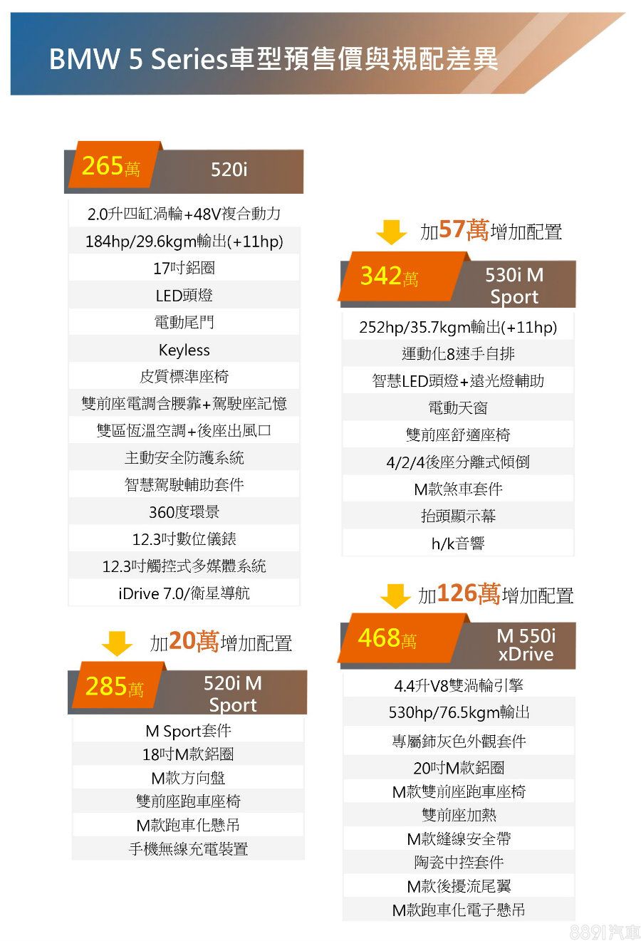 據目前資訊,小改款5 Series提供520i、520i M Sport、530i M Sport和M550i xDrive四車型,預售價分別為265、285、342與468萬元,重點規配如附表。