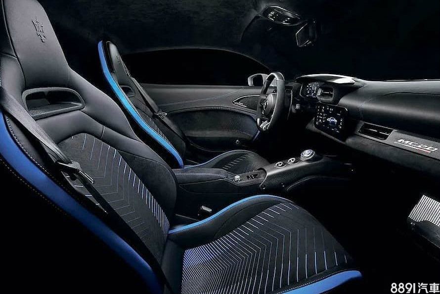 車室配置簡單,但運動感、科技感兼具。MC20配備剪裁立體的跑車型座椅,椅面採黑藍雙色對比,副駕駛座前方並有「MC20」壓印內飾板彰顯身分。駕駛介面則預期採平底方向盤、全數位儀錶及整合音響、空調和部分車輛設定之中控觸控車載系統。
