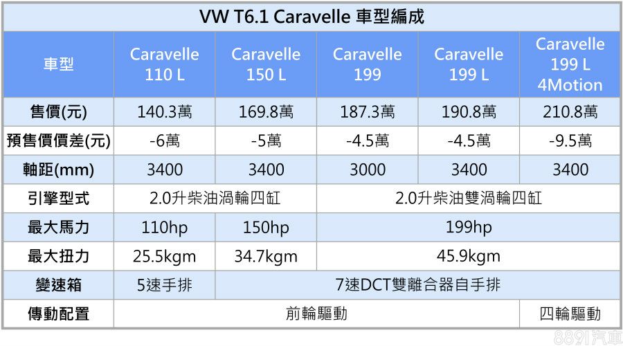 3月能源局油耗證明核發資料,福斯T6.1全新家族幾乎榜上有名,不過當時因為新冠肺炎導致工廠停工,使得上市計劃向後順延至今日。而T6.1家族由Caravelle扛起首發,提供三種輸出設定的2.0升四缸柴油引擎,除了Caravelle 199採3000mm標準軸距設定,其餘車型均為軸距增加400mm之長軸款,售價則落在140.3~210.8萬間,年底前領牌可享6萬km免費保養。