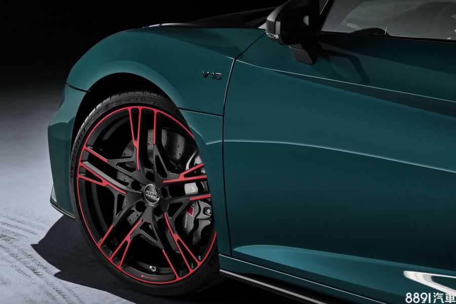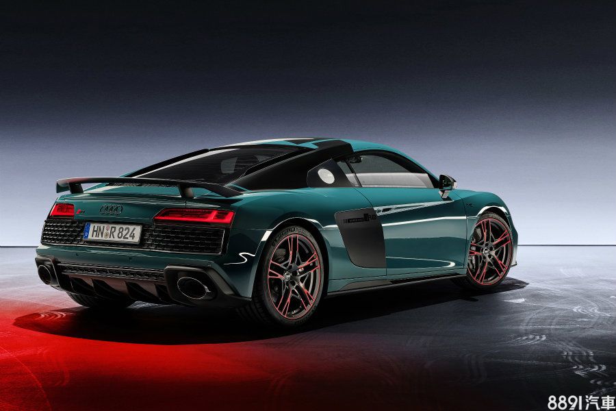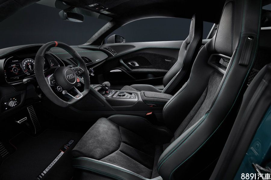 內裝大致依循既有設計,不過車艙及椅面用料換上真皮與人造麂皮相互搭配,並以藍綠色縫線穿插對比,平底方向盤也增添紅色中心標來深化競技氣息,車內踏墊則有「Green Hell R8」印記彰顯身分。