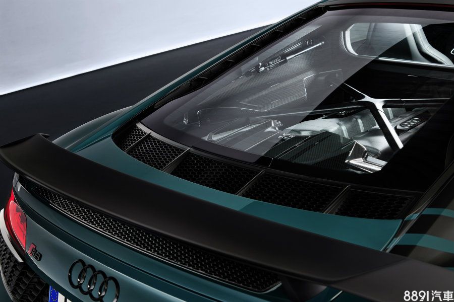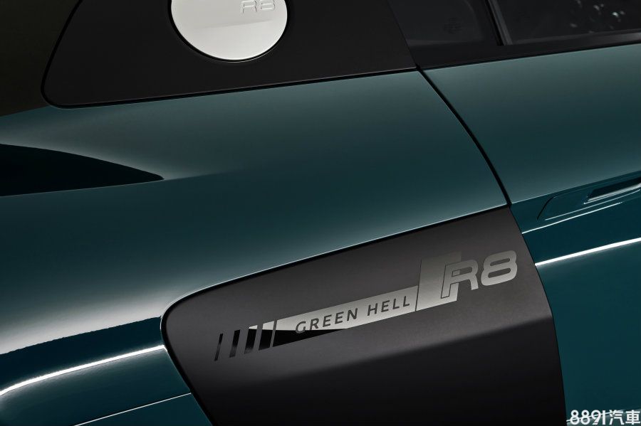 R8 Green Hell於全車保桿下緣、尾翼、後視鏡蓋及車側進氣罩均採蕭光黑部品,為外型增添幾分深邃感。而前擋玻璃上緣及車側進氣罩上,另有「Green Hell R8」的標誌,做為限量版的外觀識別。