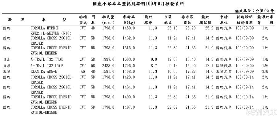 國產市場主要亮點集中在甫於日前發表的Corolla Cross身上,汽油版有著14.5km/L的平均油耗表現,而Hybrid車型則繳出21.9km/L的成績。此外,配合六期環保法規針對既有車款提供之1年緩衝期於9月告終,近兩月來亦有許多國產車款重新認證。