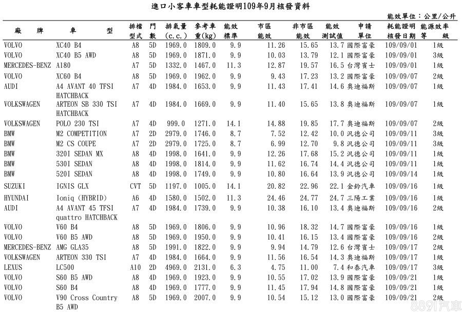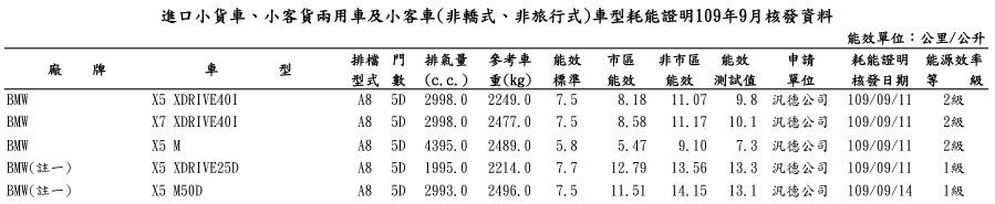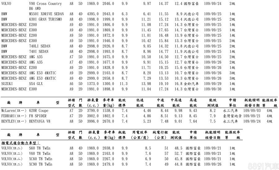 不少近期發表的進口車款也在9月完成能耗測試,包含Audi A4、BMW X5 M、賓士小改E-Class和換搭V8動力的Bentley Bentayga小改款等。而Volvo也在同月送測包含新年式XC40等多款輕油電及PHEV車型。