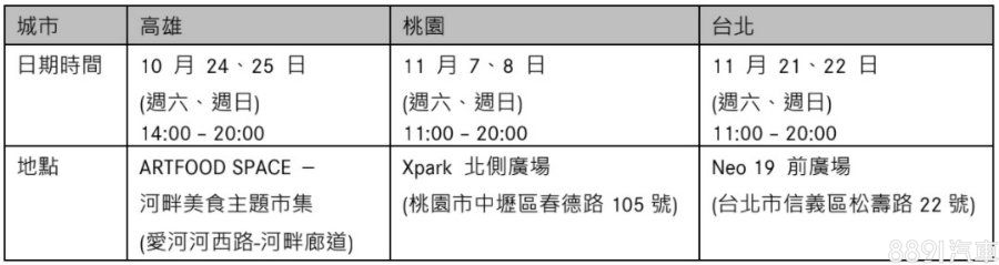 先前首站就駛進台南觀夕平台,在國慶煙火施放當天吸引數萬人體驗;第二站在台中麗寶賽車場,提供AMG車主們專屬的餐飲服務;即將於10/24、10/25舉行的第三站,將前往高雄愛河畔,在高雄電影節期間為ARTFOOD SPACE河畔美食主題市集增添話題;第四站則將於11/7、11/8到桃園Xpark北側廣場;最後一站則是11/21、11/22回到台北,在信義區Neo19前襯托著台北101的夜景,畫下完美句點。