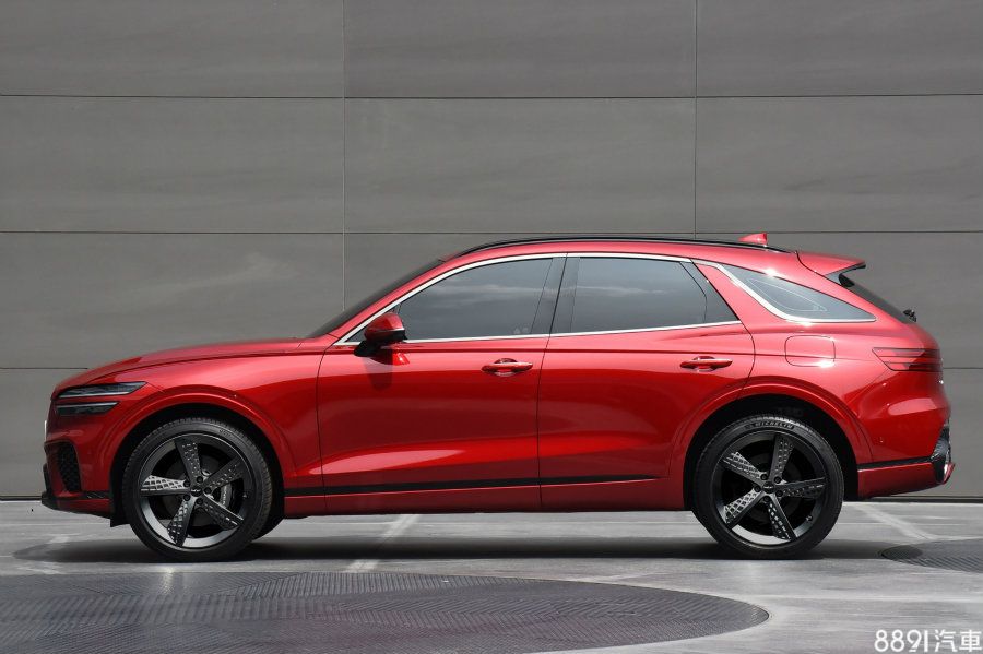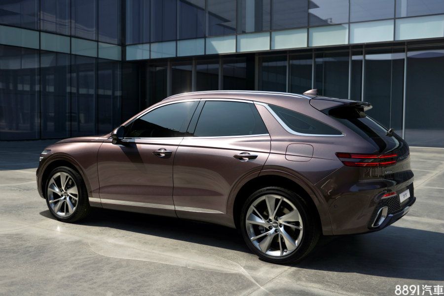 從引擎蓋一路畫向車尾的筆直腰線,助GV70車側提點出些許動感,不至於太過呆板,不過C柱獨特三角窗設計,搭配不規則的鍍鉻飾條點綴,成為車側相當易辨認的特色。雖然官方定裝照沒有公佈正車尾,但還是可見頭尾呼應的雙條式尾燈,「Genesis」字標也依然聳立在尾門上。