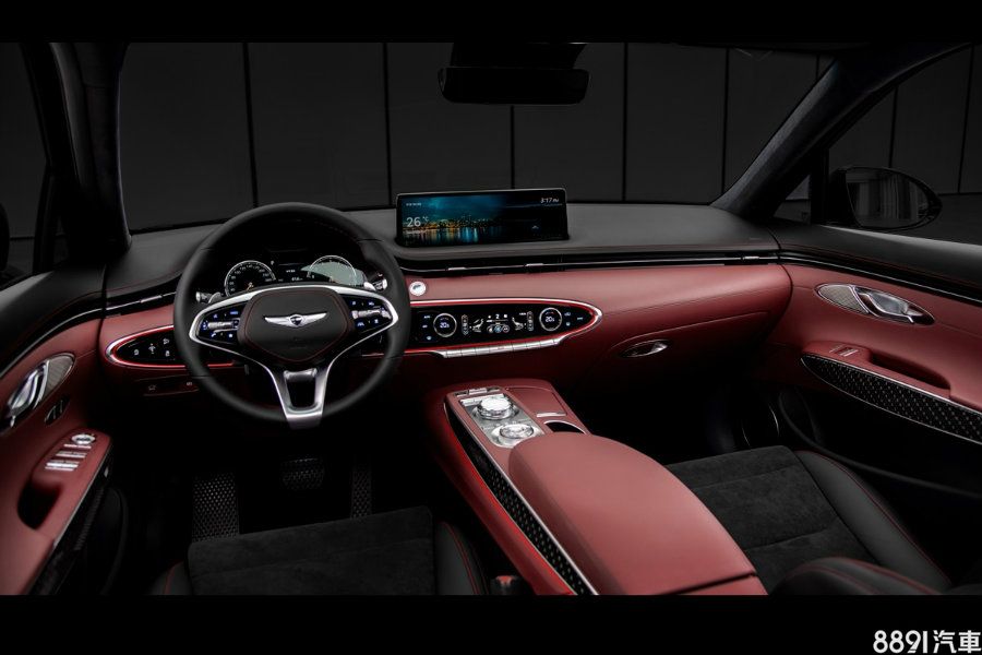 GV70 Sport車室內也會有專屬的紅內裝搭紅色縫線的組合,中央扶手及車門板處施以碳纖維飾版,方向盤改換三輻式樣,並換裝麂皮混搭真皮的運動化座椅。