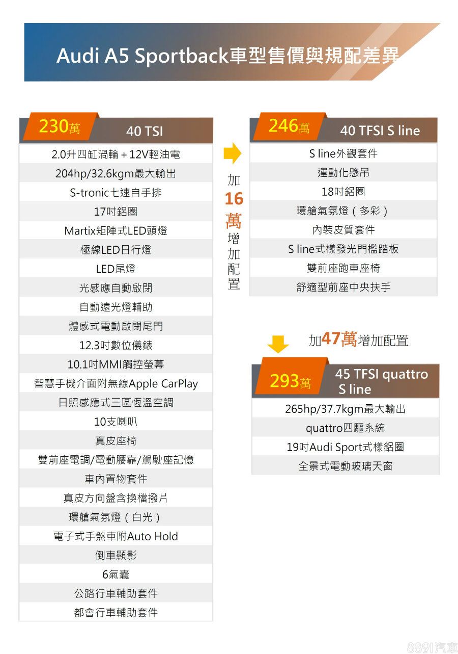 A5 Sportback 在台共設有40 TFSI、40 TFSI S line、45 TFSI quattro S line三款車型,建議售價依序為230萬、246萬與293萬,動力均採2.0升四缸渦輪引擎,搭配12V輕油電系統。