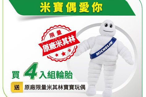 同時,活動期間內凡購買4入組輪胎,即贈送「獨家限量好禮:原廠米其林寶寶玩偶」;購買2入組輪胎或機油保養套餐,即可獲得米其林隔熱套組一份。另外,線上購買輪胎並於馳加汽車服務中心完成安裝及填寫問卷,更加碼贈送限量米其林專屬證件套。