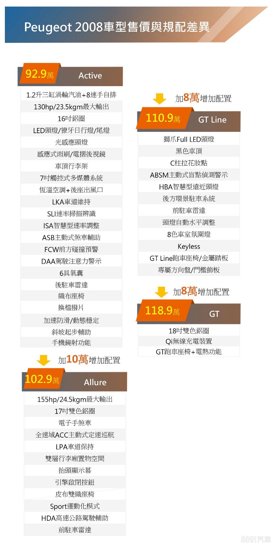 一如先前我們報導,大改款2008在台提供Active、Allure、GT Line和GT四車型,售價分別為92.9、102.9、110.9和118.9萬元,原廠公布的重點規配如附表。同時總代理寶嘉聯合也推出限時限量早鳥優惠,包含高額分期超低利率,再加贈3年3萬公里免費保養,活動到2020年12月31日止。