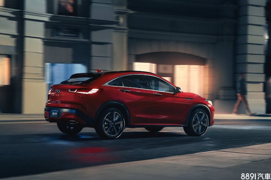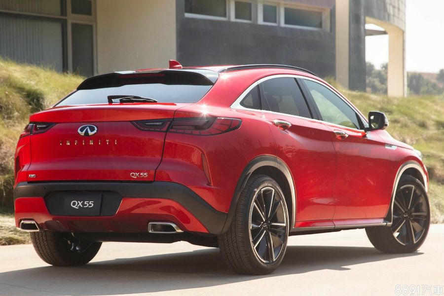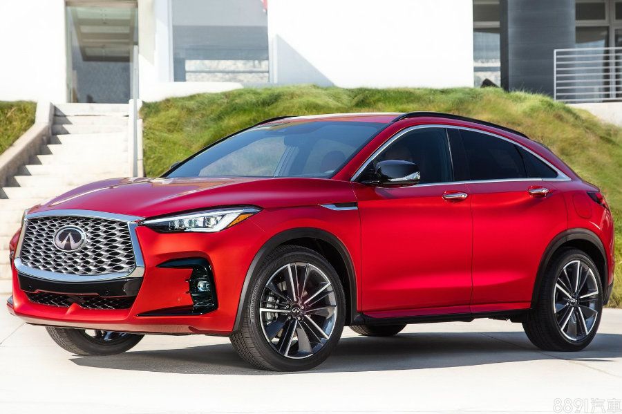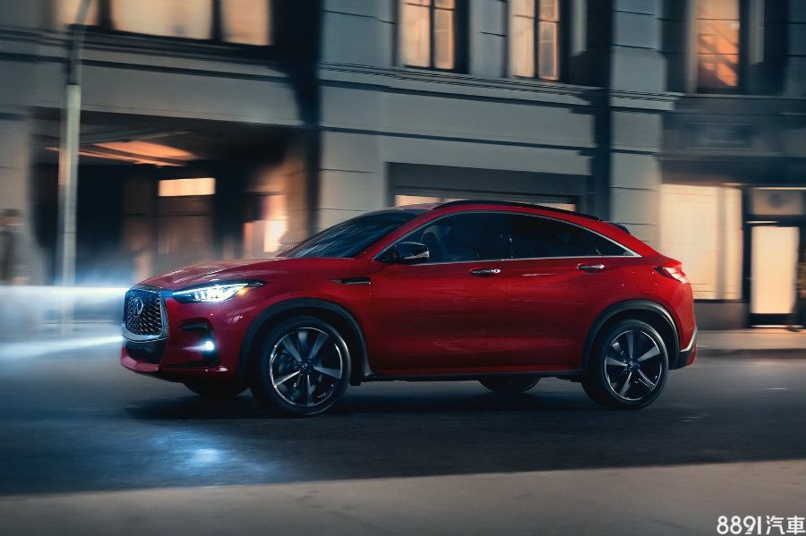新車外觀以FX車系為靈感,讓人再度憶起初代FX問世時給人帶來的濃厚跨界感受,這點可自高腰線、自B柱開始向下傾斜的車頂線條、傾斜的後擋風玻璃等設計窺見,可選8種車色,美規版本標配20吋鋁圈。