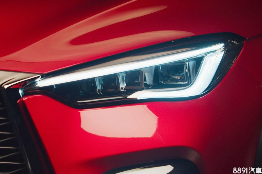 LED頭燈組輪廓頗為犀利, LED日行燈造型彷若眉型,此種設計已於QX50上可見。