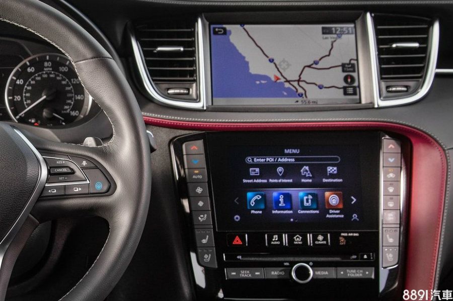 雙觸控多媒體系統由上方8吋、下方7吋的觸控式螢幕構成,搭載最新的Infiniti InTouch,整合藍芽、娛樂、導航、無線Apple CarPlay(首款搭載此功能的Infiniti)、Wi-Fi熱點、車況訊息等功能,可使用排檔座右側旋鈕等介面控制。