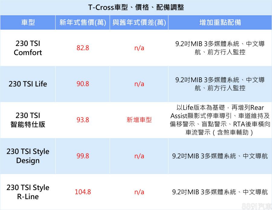2021年式T-Cross常態販售之車型維持四種選項:230 TSI Comfort、230 TSI Life、230 TSI Style Design和230 TSI Style R-Line,在正式售價未有變動的前提下,全車系新增9.2吋MIB 3多媒體鏡面觸控主機及原廠中文導航,230 TSI Comfort與Life車型也將前方行人監控系統列為全車系標配。