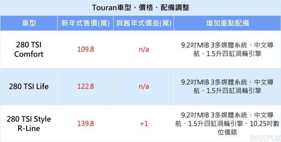 2021年式Touran維持三車型編成:280 TSI Comfort、280 TSI Life和280 TSI Style R-Line,全車系同樣升級9.2吋MIB 3多媒體鏡面觸控主機及原廠中文導航,並換上具備ACT主動式汽缸休止管理系統的1.5升TSI四缸渦輪汽油引擎(150hp/25.5kgm)。