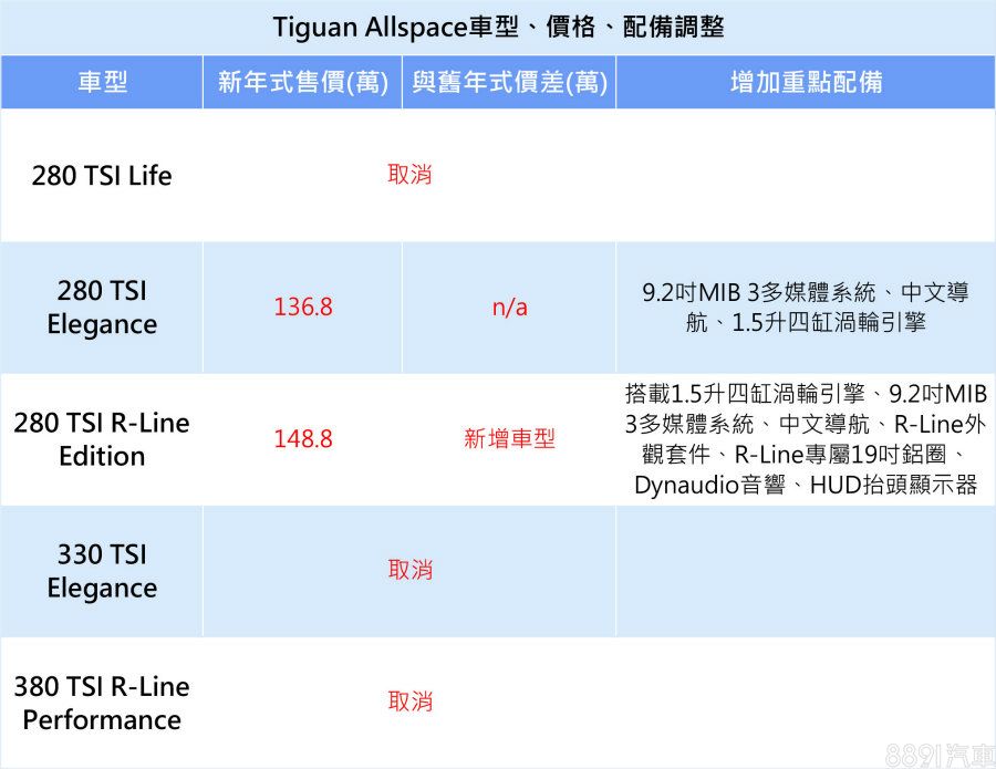 至於2021年式Tiguan Allspace則進行了車型縮編,取消原先的280 TSI Life、330 TSI Elegance和380 TSI R-Line Performance,新增售價為148.8萬的280 TSI R-Line Edition,致使車系目前僅提供280 TSI Elegance與280 TSI R-Line Edition雙車型。