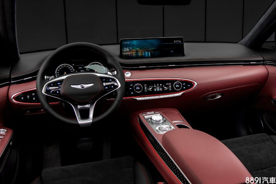 GV70 Sport版本改搭專屬的紅內裝搭紅色縫線的組合,中央扶手及車門板處施以碳纖維飾版,方向盤改換三輻式樣,並換裝麂皮混搭真皮的運動化座椅。