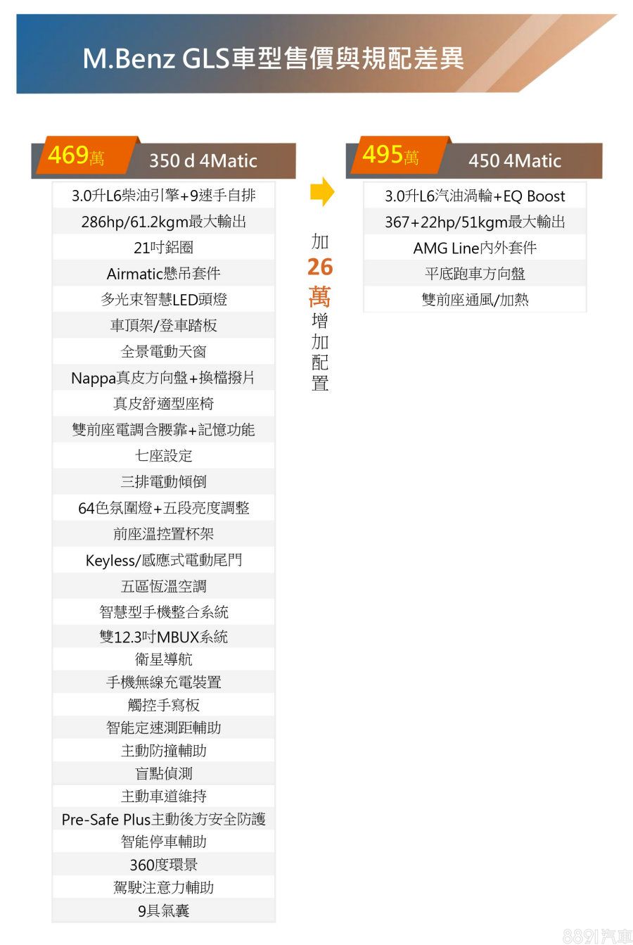 新年式GLS車系提供GLS 350 d 4Matic、GLS 450 4Matic兩車型,售價分別為469、495萬元,前者較舊年式有著9萬元之漲幅,後者開價495萬元,重點規配如附表。