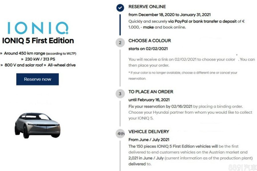 由於國外Hyundai新車網站「失誤」,提前釋出Ioniq 5的訂購網頁(目前已下架),因此讓我們得以提前一窺新車動力細節。以E-GMP電動車平台打造的新車,軸距達3000mm,整體身型約莫比自家的Tucson略大上一些。