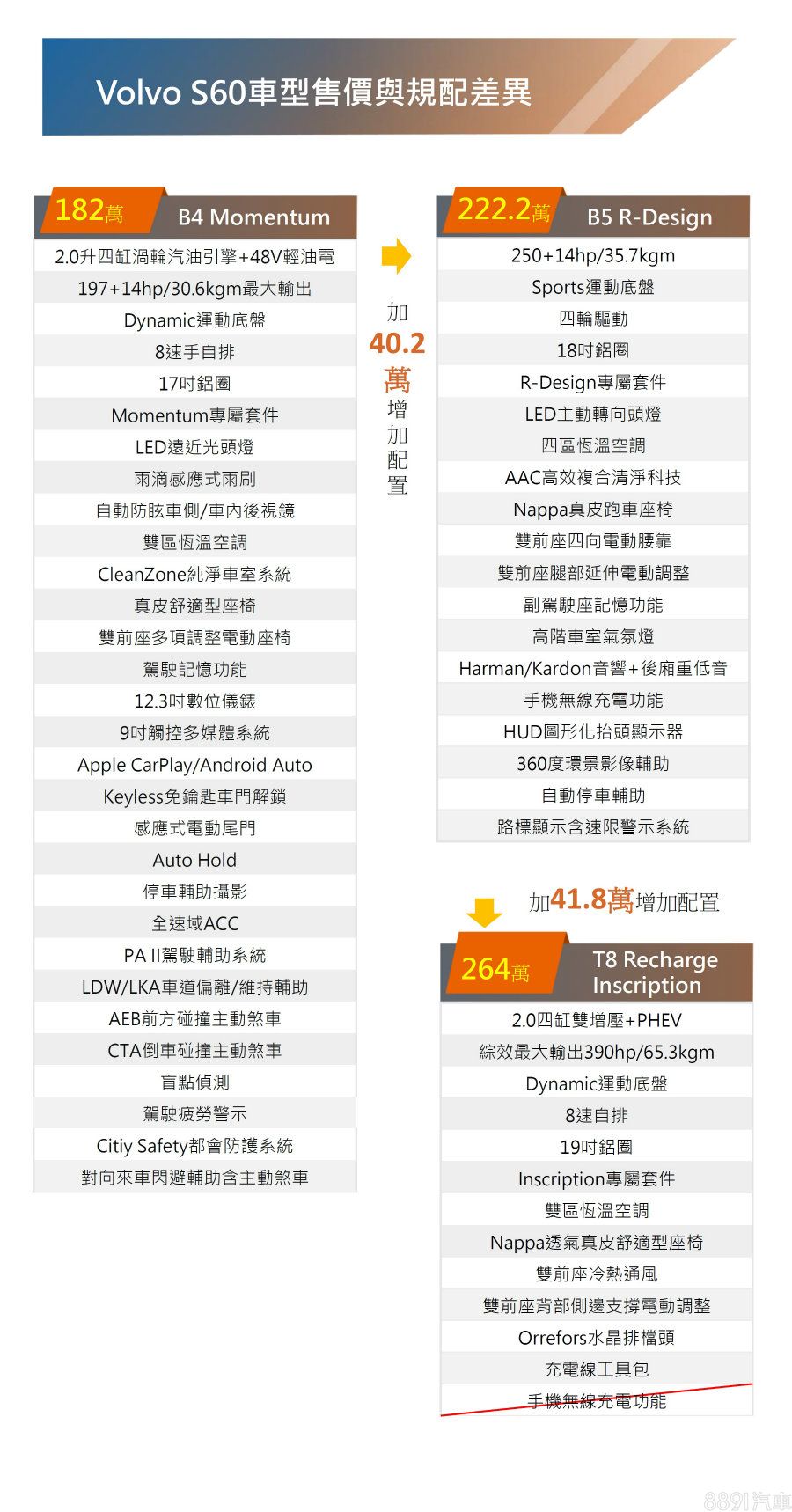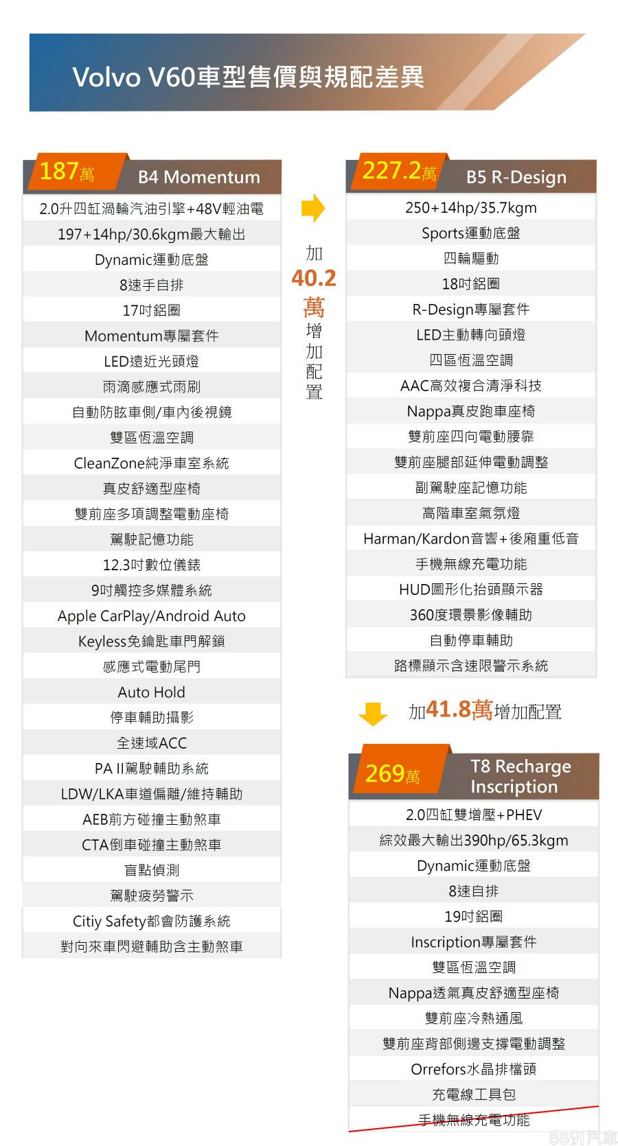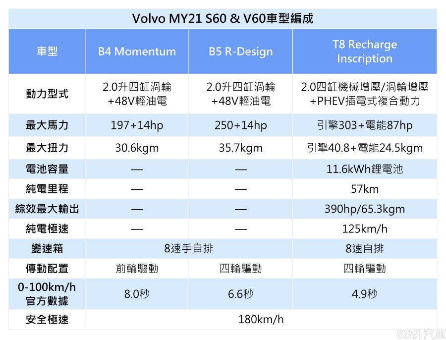 新年式S60與V60皆維持3車型的設定,入門及中階依序為B4 Momentum與B5 R-Design,原本高規的T6 Twin Engine Inscription取消,改由車系首次導入的T8 Recharge Inscription取代,各車型建議售價如上表。