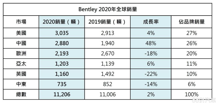 從官方統計數據來看,北美仍是賓利最大市場,2020年共交付3035輛,削幅成長4%,不過中國市場急起直追,以48%的成長率繳出2880輛的佳績,並且超過歐洲,成為賓利第二大區域市場,佔有率也從17%提升至26%,成長度速驚人。