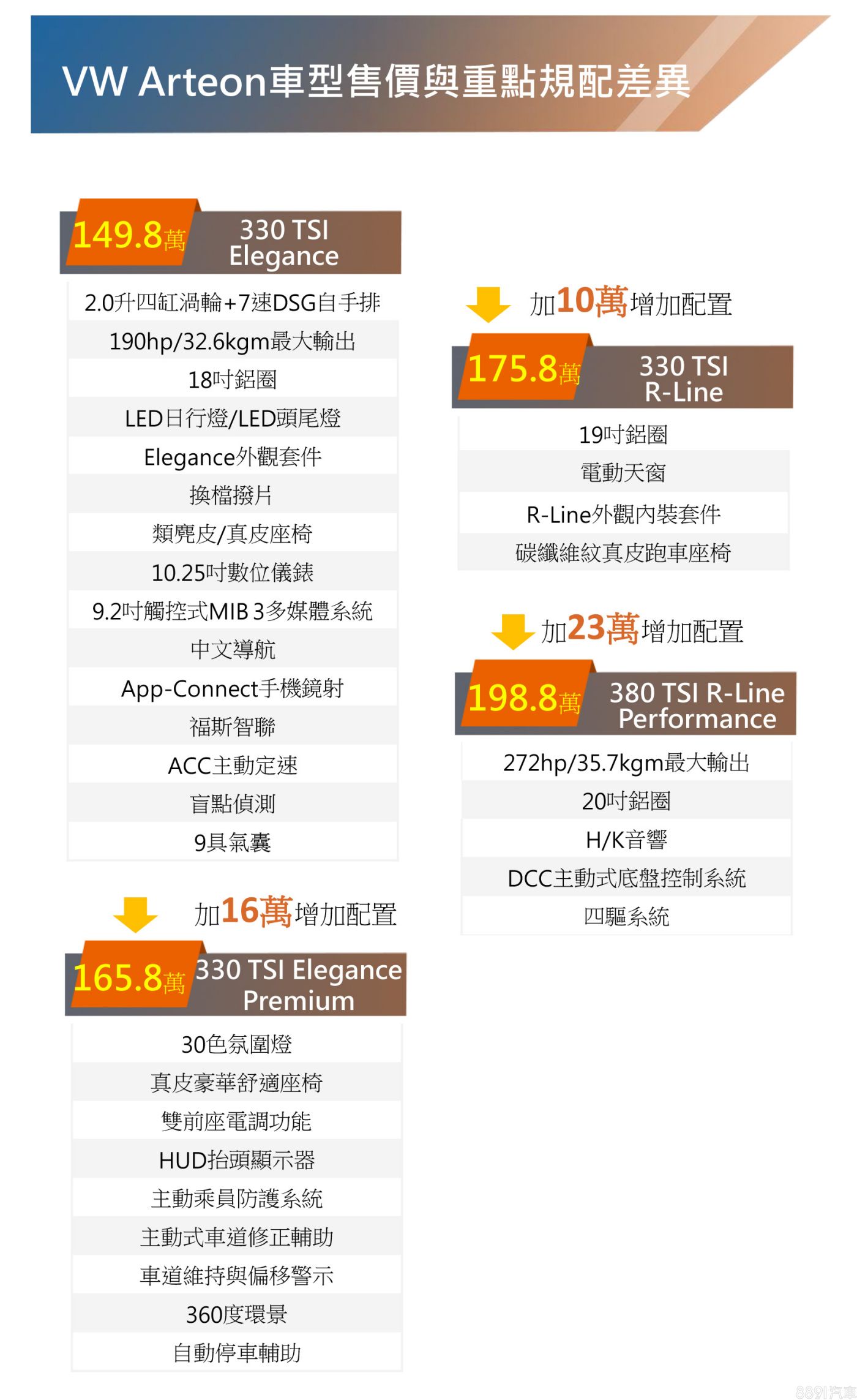 小改款Arteon提供330 TSI Elegance、330 TSI Elegance Premium、330 TSI R-Line和380 TSI R-Line Performance共4車型,售價分別為149.8、165.8、175.8和198.8萬元。