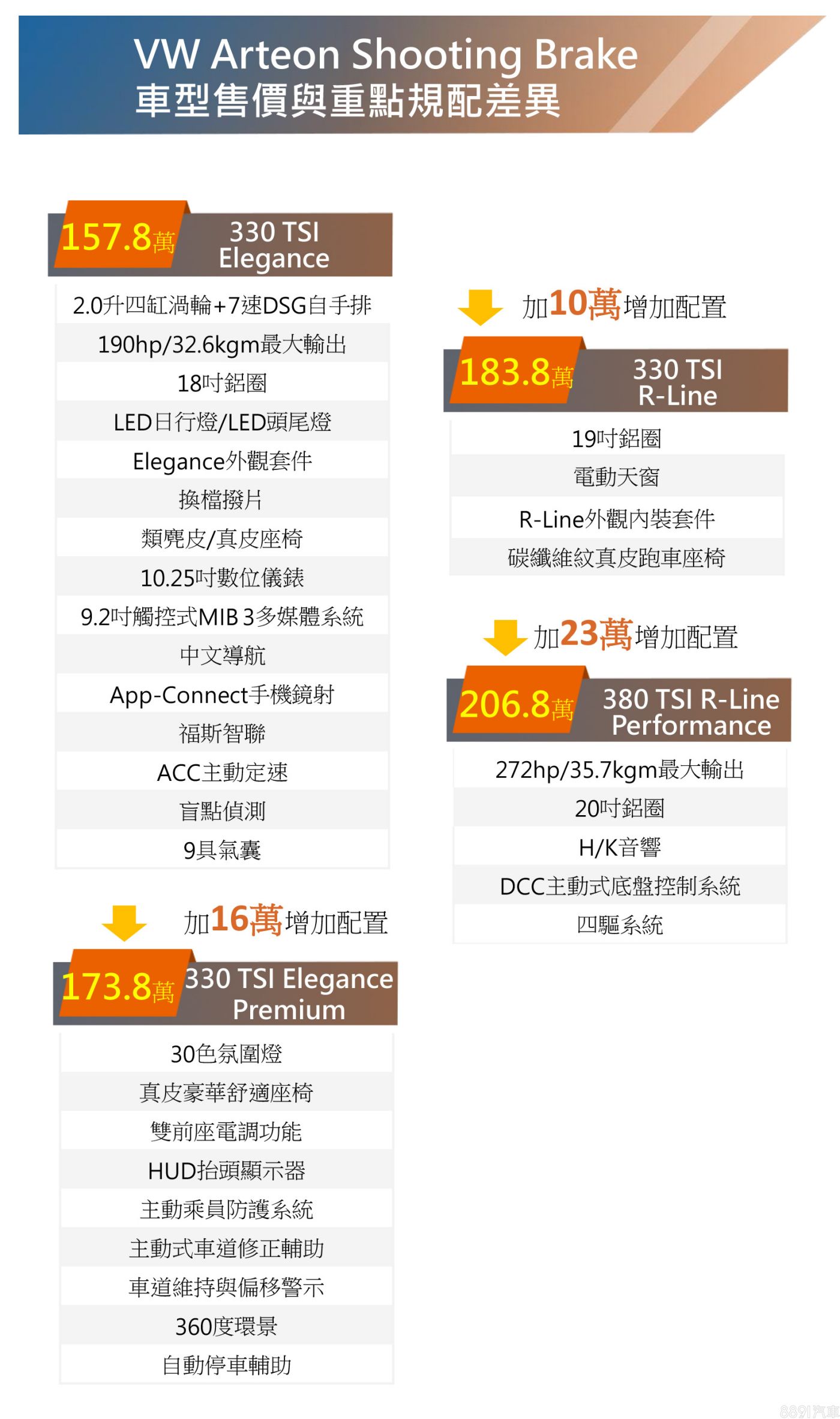 至於小改款Arteon Shooting Brake不同於預售時的3車型編成,追加入門選項也提供4種版本:330 TSI Elegance、330 TSI Elegance Premium、330 TSI R-Line及380 TSI R-Line Performance,各開出157.8、173.8、183.8和206.8萬元之售價。不管是Fastback或Shooting Brake車型,與預售價相比,頂規版本都擁有最大3萬之降幅,中階車型降幅則為2萬元。