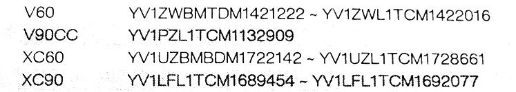 受影響車輛為2020年9/10~10/1間生產的少部分V60、V90 CC、XC60和XC90,車身號碼參考範圍如附表。以上為受影響的參考範圍,範圍內的車主若未接獲掛號信函通知,則與此次召回無關。