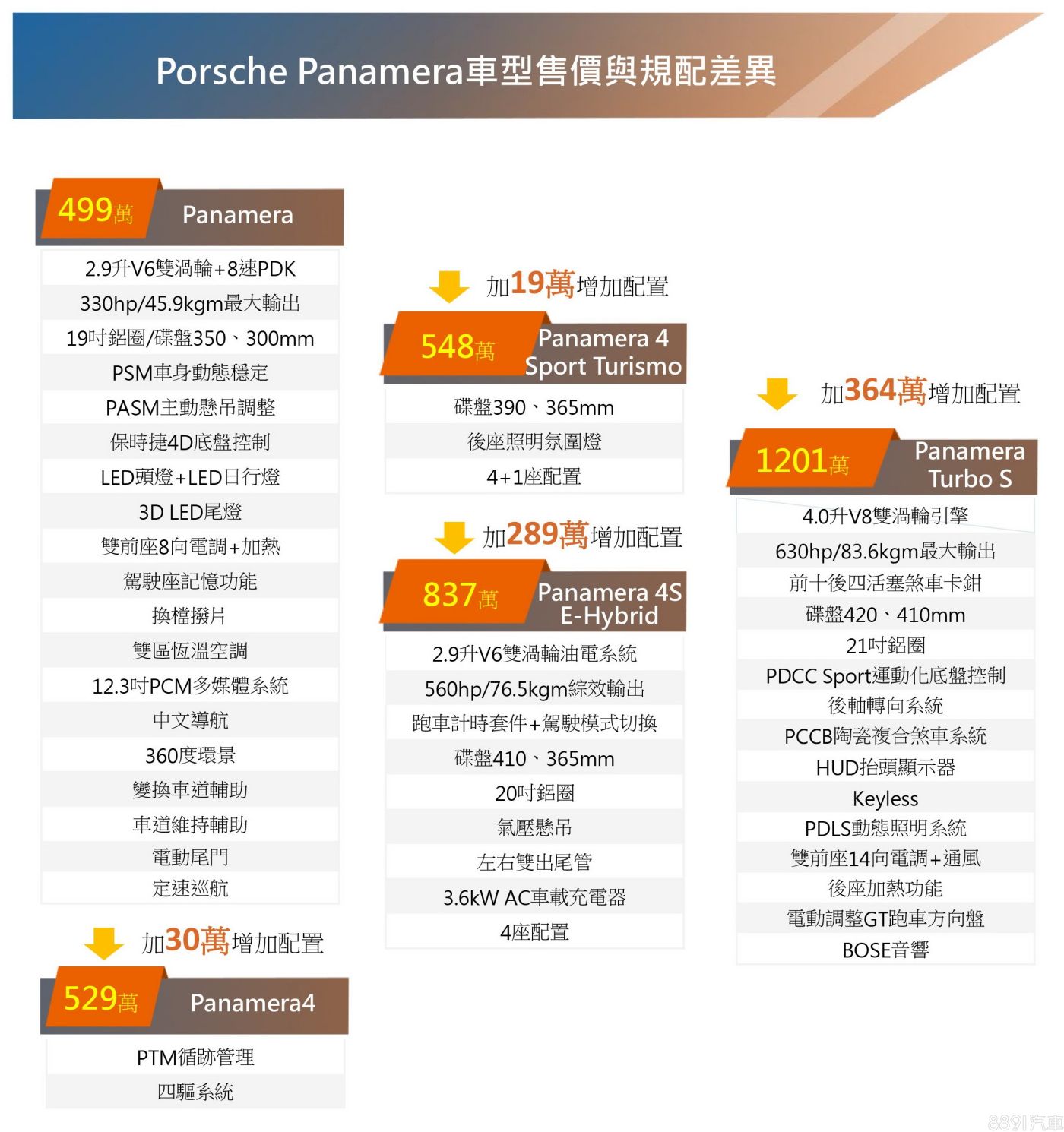 台灣Porsche目前提供的小改款Panamera車系,提供Panamera、Panamera 4、Panamera 4 Sport Turismo、Panamera 4S E-Hybrid和Panamera Turbo S,售價分別為499、529、548、837和1201萬元。