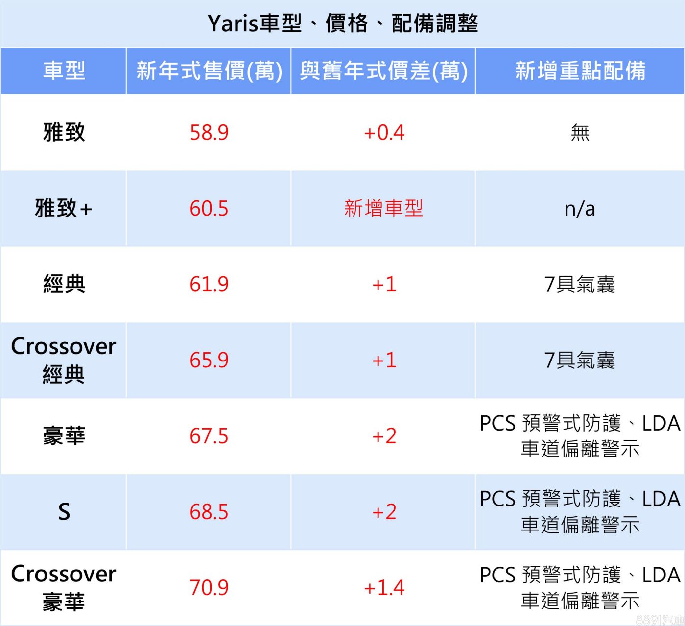 2021年式Yaris車系追加了二階的雅緻+,致使全車系達7車型編成:雅致、雅致+、經典、Crossover經典、豪華、S和Crossover豪華,售價分別為58.9、60.5、61.9、65.9、67.5、68.5和70.9萬元,較先前漲幅範圍為0.4~2萬,但配備方面也有小幅升級。